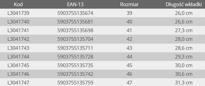 Poniżej tabela z długościami wkładek dla lepszego doboru obuwia.