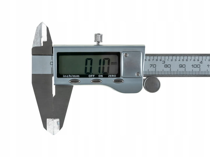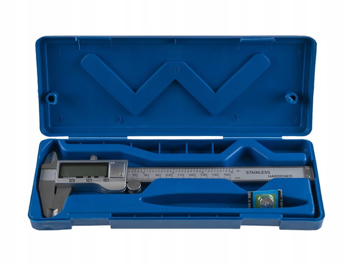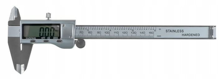 Suwmiarka elektroniczna pokazuje pomiar w calach lub milimetrach do dokładności 0,01 mm. Zakres pomiaru wynosi 0-150 mm.