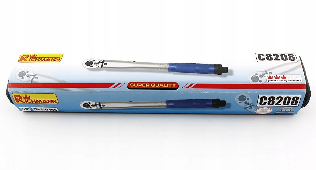 Klucz dynamometryczny marki Richmann (dawniej Corona). Narzędzie precyzyjne służące do dokręcania połączeń gwintowych z siłą o dokładnie określonym momencie. Klucz posiada mechaniczny naciąg zapadki dynamometrycznej, która po osiągnięciu żądanej siły dokręcania przeskakuje o jeden ząbek, wydając charakterystyczny dźwięk. Skala momentów umieszczona jest w rączce klucza, jej regulacja następuje poprzez obrót rękojeścią. Po ustawieniu żądanego momentu należy zablokować klucz zabezpieczeniem na końcu rączki. Długość klucza 380 mm.