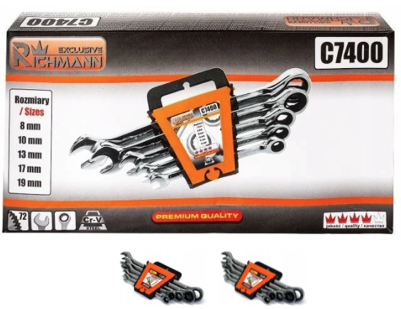 - w skład zestawu kluczy płasko oczkowych z grzechotką C7400 wchodzą klucze w rozmiarze: 8, 10, 13, 17 i 19 mm;