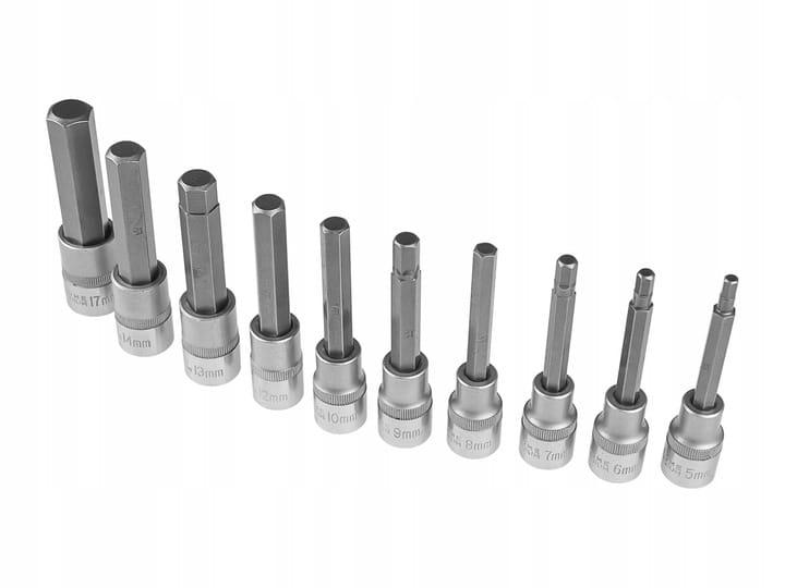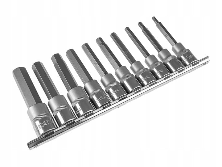 Nasadki umieszczone na metalowej listwie, wykonane są z wysokiej jakości stali S2, która zapewnia doskonałą wytrzymałość narzędzi.