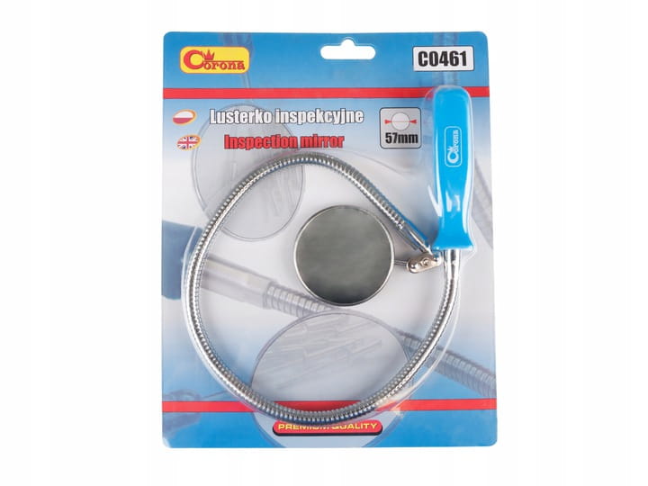 Przedmiotem aukcji jest lusterko inspekcyjne okrągłe giętkie marki Corona. Produkt pomocny w każdym zakładzie mechanicznym i samochodowym, pozwala na ujrzenie trudno dostępnych miejsc. Lusterko zamontowane jest na giętkim wysięgniku który można dowolnie kształtować. Pokryte jest powłoką antykorozyjną, posiada ergonomiczny uchwyt z miękkiego tworzywa