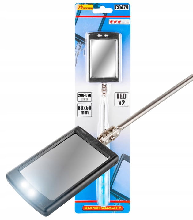 Prostokątne teleskopowe lusterko inspekcyjne z podświetleniem LED o wymiarach 80 x 50 mm.