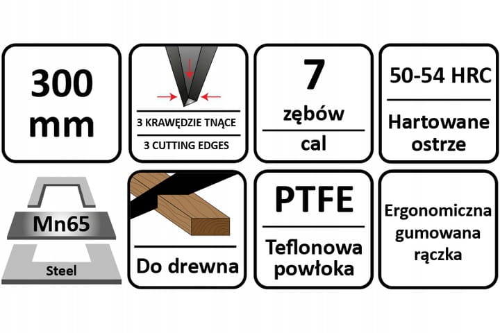 Pokryta powłoką teflonową (PTFE) zapobiegającą przywieraniu do mokrego drzewa oraz zapewni gładkie cięcie z małymi oporami.