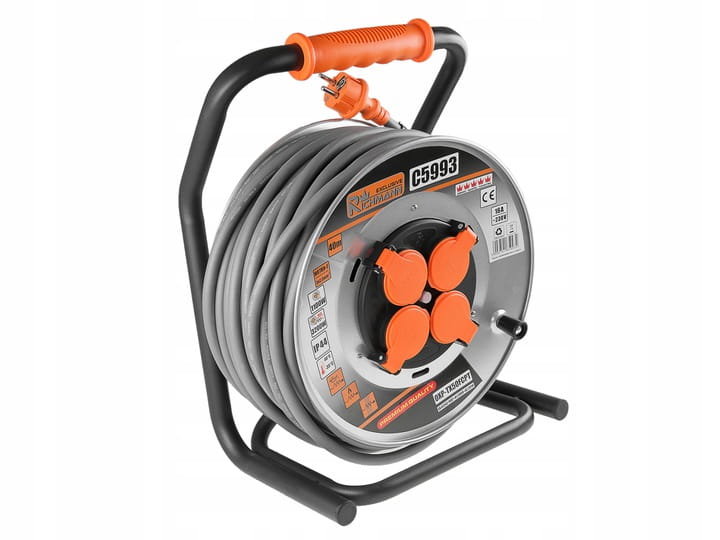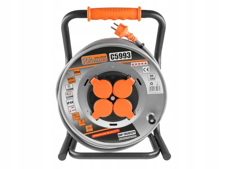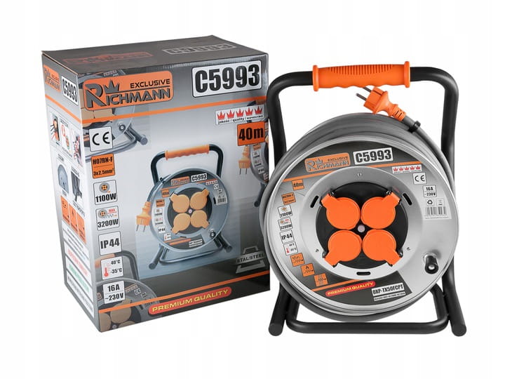 Przedmiotem aukcji jest przedłużacz bębnowy marki Richmann Exclusive (dawniej Richmann Exclusive) o długości 40 metrów. Idealnie sprawdzi się do podłączenia przydomowych urządzeń elektrycznych takich jak kosiarka, odkurzacz samochodowy, wiertarka oraz wszelkiego rodzaju innych urządzeń.