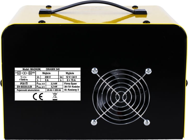 Prostownik z rozruchem do ładowania akumulatorów w autach osobowych, dostawczych, oraz maszynach budowlanych. Urządzenie umożliwia ładowanie akumulatorów do pojemności 200Ah, o napięciu prądu ładowania 12/24V. Dinamik 540 spełnia wymagania norm europejskich w zakresie bezpieczeństwa, posiada zabezpieczenie termiczne.