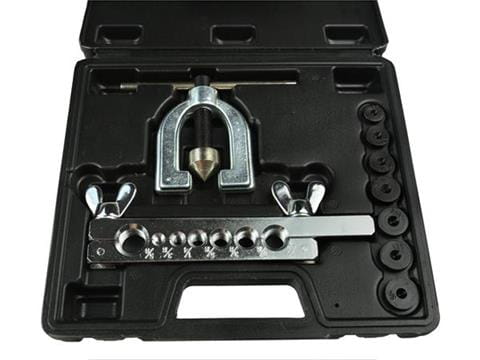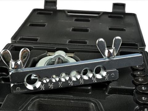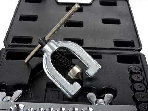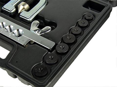 Zestaw do zarabiania przewodów hamulcowych i paliwowych. Nadaje się do cięcia i kielichowania miedzianych, mosiężnych, aluminiowych rurek i przewodów o ściankach o grubości do 1mm.