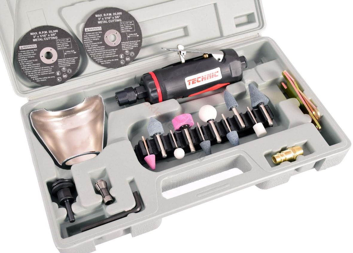 Szlifierka do cięcia i szlifowania niewielkich elementów. Rękojeść pokryta jest gumą, tarczę wymieniamy za pośrednictwem kluczy zawartych w zestawie. Zestaw jest solidnie wykonany i wyposażony w redukcję na trzpienie 3 lub 6 mm. Ponadto można wykorzystać ją do cięcia. Komplet znajduje zastosowanie w serwisach samochodowych różnego rodzaju warsztatach, w modelarstwie jak również w gospodarstwach domowych.