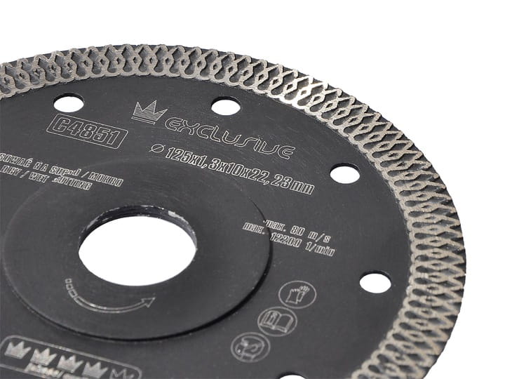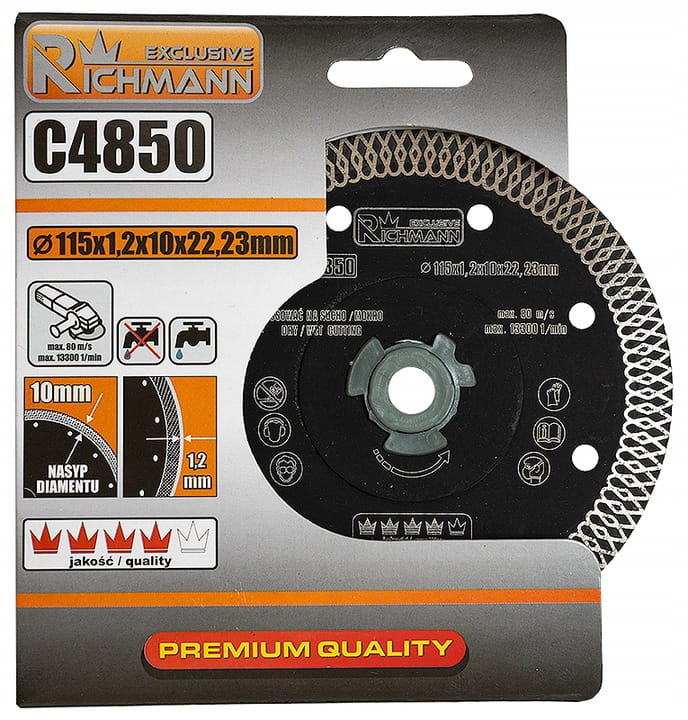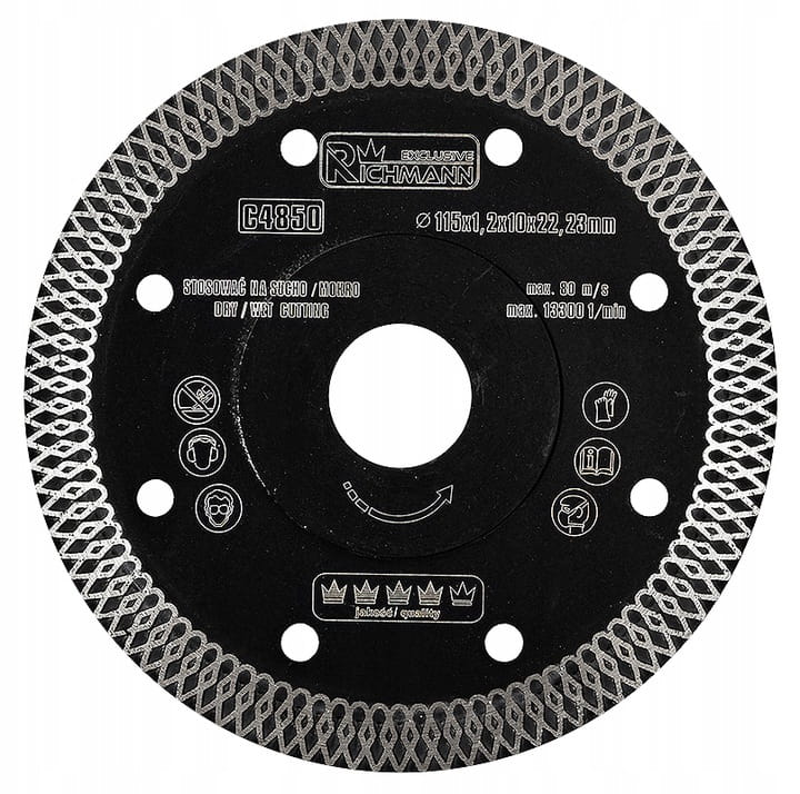Przedmiotem aukcji jest ultra cienka tarcza diamentowa marki Richmann Exclusive przeznaczona do cięcia materiałów takich jak: klinkier, glazura, gres, marmur, granit, dachówka. Specyficzny profil obrzeża diamentowego pozwala na cięcie z dużą prędkością najtwardszych materiałów bez uszczerbku dla jakości wykończenia. Średnica tarczy wynosi: 115 mm, grubość: 1,2 mm, otwór: 22,23 mm, powierzchnia diamentowa 10 mm.
