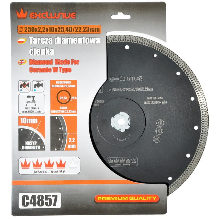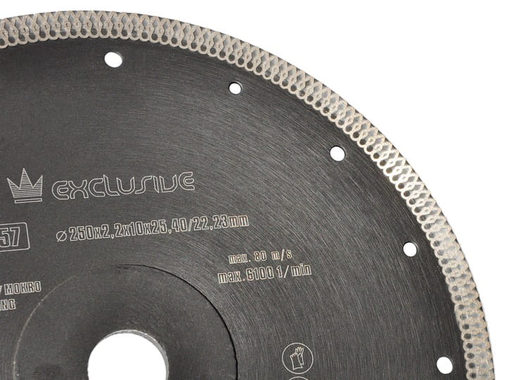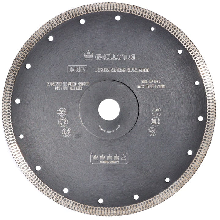 Przedmiotem aukcji jest ultra cienka tarcza diamentowa marki Richmann Exclusive przeznaczona do cięcia materiałów takich jak: klinkier, glazura, gres, marmur, granit, dachówka. Specyficzny profil obrzeża diamentowego pozwala na cięcie z dużą prędkością najtwardszych materiałów bez uszczerbku dla jakości wykończenia. Średnica tarczy wynosi: 250 mm, grubość: 2,2 mm, otwór: 22,23 mm, powierzchnia diamentowa 10 mm.