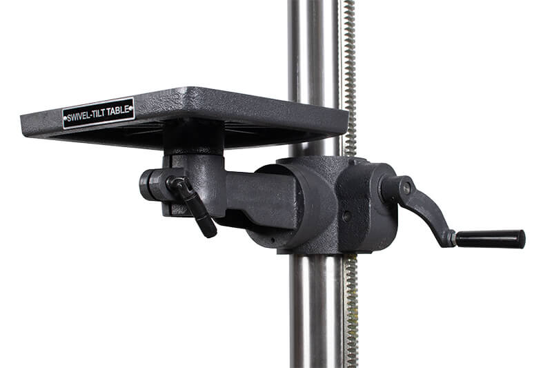 - stół roboczy może być obracany o 360° za pomocą sworznia obrotowego i pochylany w zakresie +/-45°, co umożliwia wiercenie otworów pod różnymi kątami