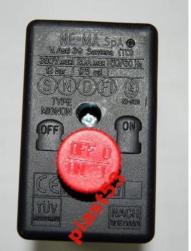 | e-mail - spaw7@interia.pl telefon komórkowy - 509-952-502,501-485-818 tel.fax 32 62 33 423 gadu-gadu - 7859758 Poczta - przedpłata 14 Poczta - pobranie 18 Kurier - pobranie 26 Kurier - przedpłata 21 Bank BPH S.A. 50 1060 0076 0000 3070 0108 8102 | Przedmiotem aukcji jest nowy wyłącznik ciśnieniowy firmy NE-MA przeznaczony do współpracy z silnikiem o mocy max 2.2 kW i zasilaniu jednofazowym 230V