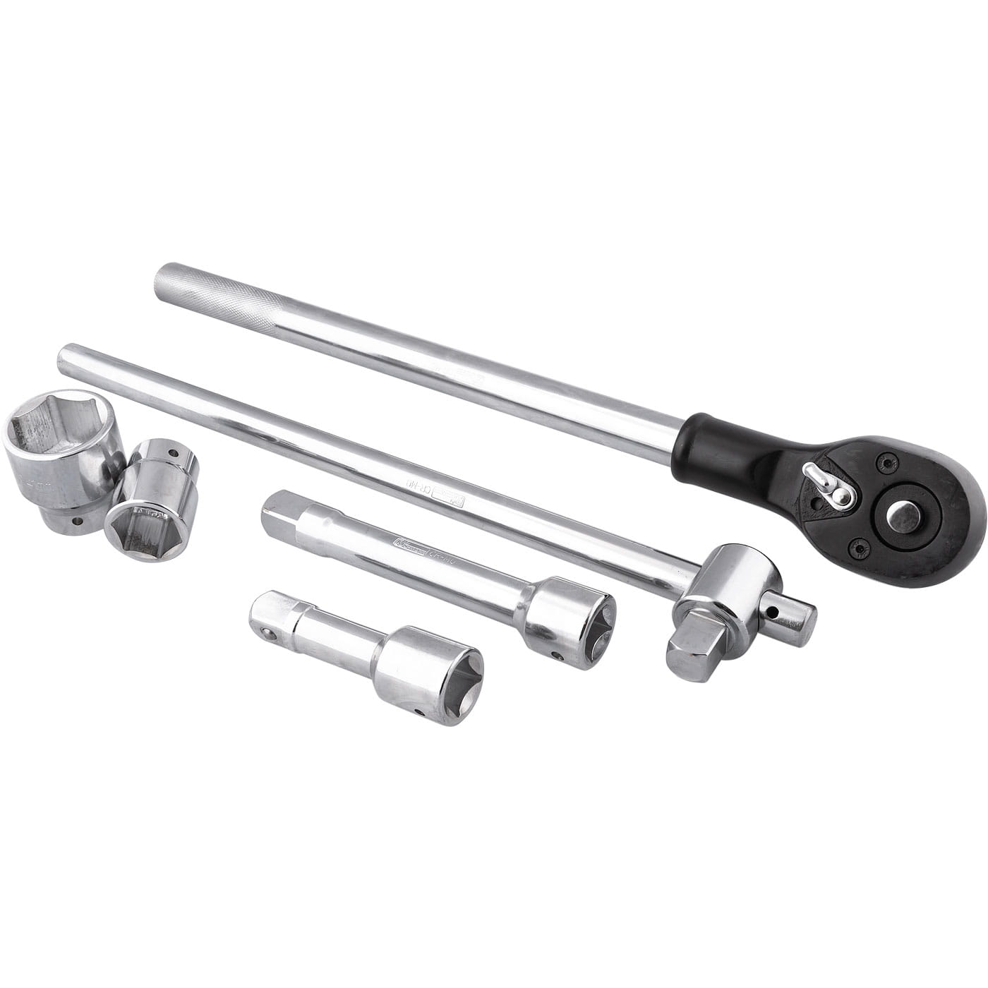19 – elementowy zestaw kluczy nasadowych 6-kątnych z grzechotką 3/4" w zakresie rozmiarów 22-65 mm.