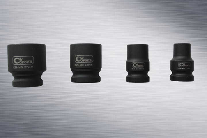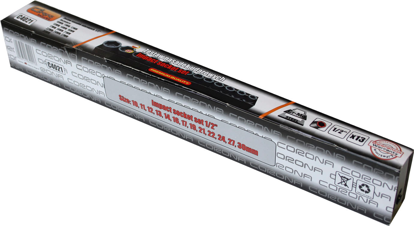 Nasadki udarowe metryczne 1/2" w zakresie 10 - 30 mm z dożywotnią gwarancją producenta na wady fabryczne i materiałowe. 13 sztuk Corona Exclusive. Nasadki udarowe dostarczane w metalowym pojemniku rączką do przenoszenia.