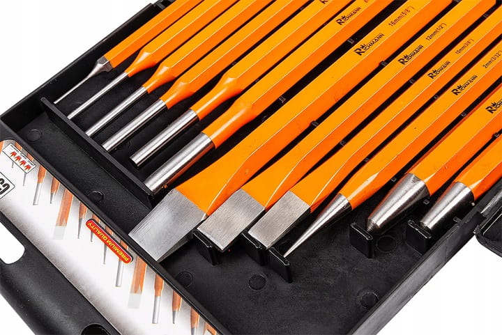 Zestaw umieszczony w praktycznym etui na zatrzask ułatwiającym przechowywanie ze względu na uporządkowane miejsca na każdy przebijak z możliwością zawieszenia zestawu na haku np. w warsztacie.