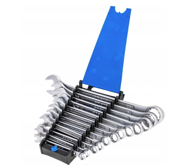 - zestaw umieszczony w zawieszce ułatwiającej przechowywanie ze względu na uporządkowane miejsca na każdy klucz oraz oczkiem do zawieszenia na haku np. w warsztacie